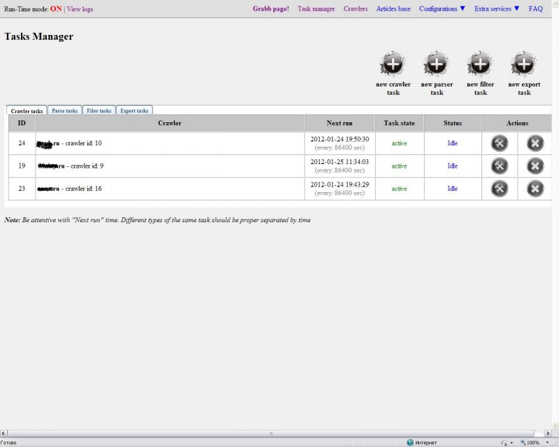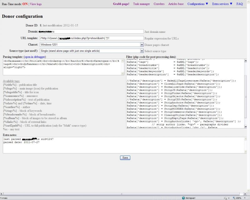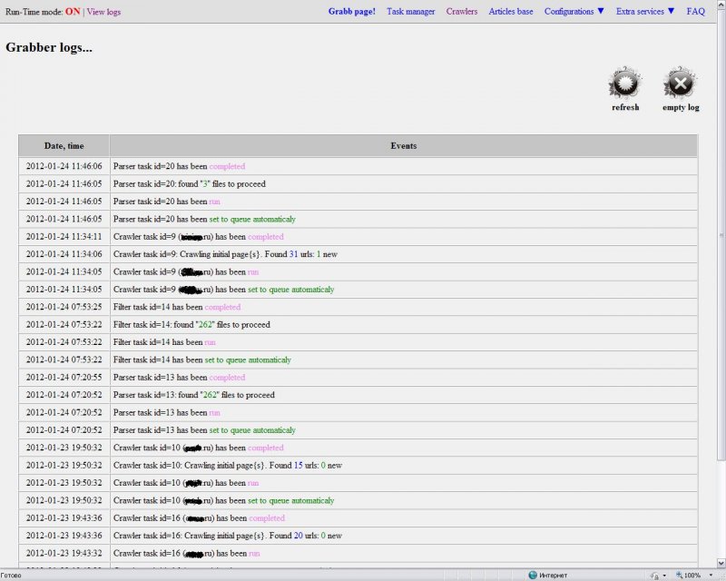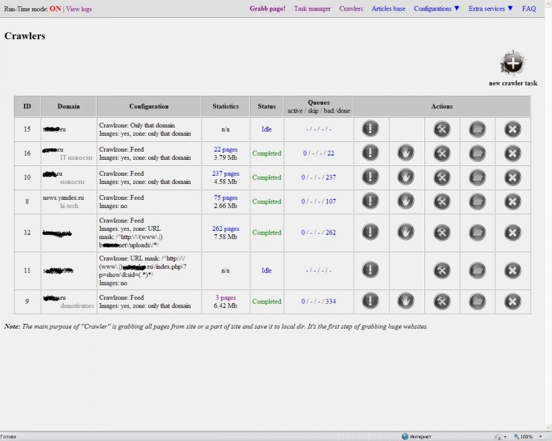 - грабинг в режимах crawler/mask/list/feed;