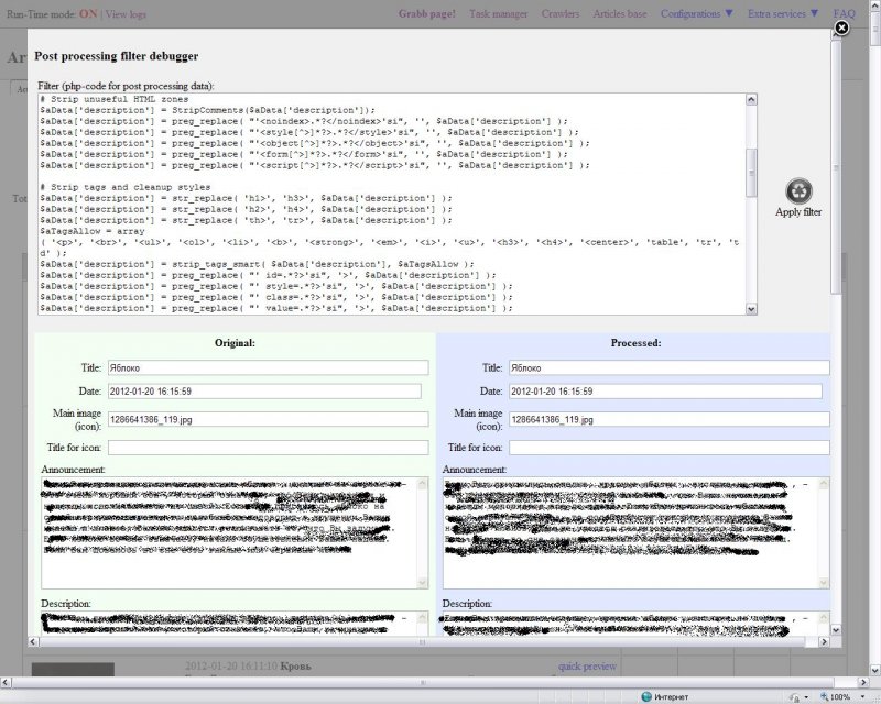 - промежуточная коррекция результатов с использоанием как регулярных выражений, так и непосредственно php функций;